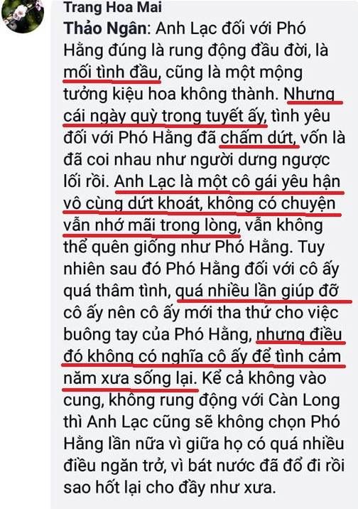 Nhiều người khẳng định: "Anh Lạc đồng ý tâm nguyện của PH vì PH vẫn là người Lạc yêu...". Vậy xem ra, theo suy luận "logic" của mấy bạn trẻ này, giờ mình cũng nói: Chân Hoàn cho đến cuối đời vẫn còn yêu Ung Chính thì đúng hay là sai?