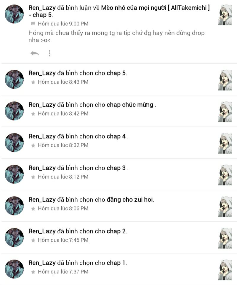 Nhất là 2 bạn Ren_Lazy và KhnhLynNguyn đã bình chọn hết các chap của tui nha , giờ tui được tận 73 bình chọn rùi , vui quớ ~~~~