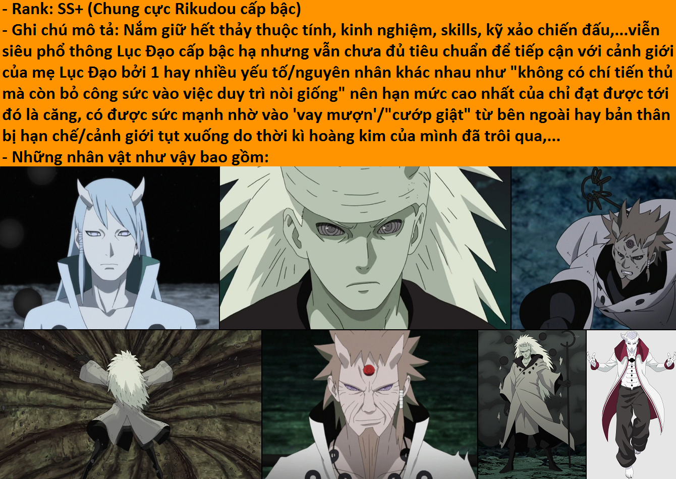 +) Đỉnh phong/đỉnh cấp nguỵ Lục Đạo: Naruto baryon mode (kiểu bộc phát 1 lần); Senju Hashirama (trạng thái hiền nhân + tiên pháp mộc độn_chân sổ thiên thủ) thời còn sống; Maito Gai trạng thái tử môn (kiểu bộc phát 1 lần);...