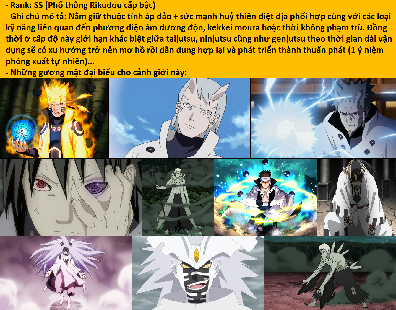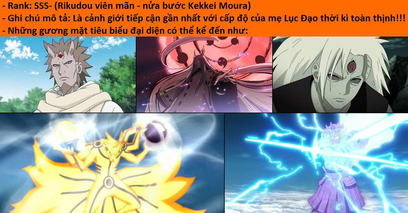 - Rank SS (phổ thông Lục Đạo cấp bậc): Là cảnh giới nắm giữ thuộc tính áp đảo (đại khái khoảng 1000~3000) + sức mạnh huỷ thiên diệt địa phối hợp cùng với các loại kỹ năng/skills liên quan đến phương diện âm dương độn/huyết kế võng la hoặc thời không phạm trù. Đồng thời ở cấp độ này giới hạn khác biệt giữa thể thuật, nhẫn thuật cũng như huyễn thuật theo thời gian dài vận dụng sẽ có xu hướng trở nên mơ hồ rồi dần dung hợp lại và phát triển thành thuấn phát (1 ý niệm là phóng xuất ra)!!!