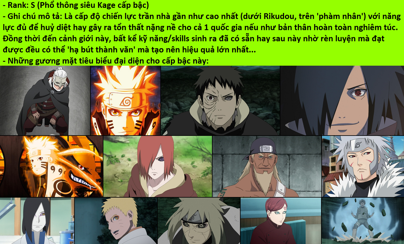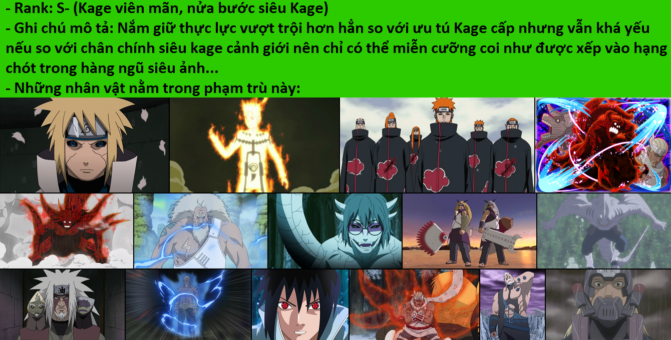 - Rank S- (ảnh cấp viên mãn, nửa bước siêu ảnh): Là cấp bậc nắm giữ thực lực vượt trội hơn hẳn so với với ưu tú ảnh giả nhưng vẫn yếu hơn 1 chút so với chân chính siêu ảnh cấp bậc (đại khái khoảng 135~205) nên chỉ có thể miễn cưỡng coi như xếp vào hạng chót trong hàng ngũ siêu Kage!!!