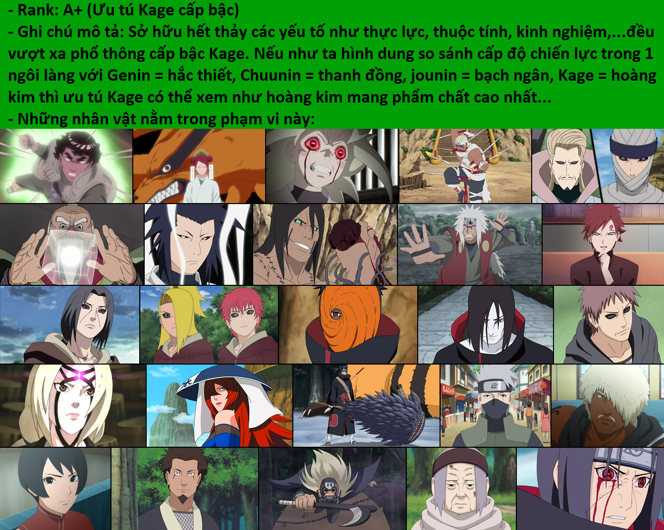 +) Cao giai ưu tú ảnh cấp (cao cấp ưu tú kage): Deidara và Uchiha Itachi trạng thái edo tensei; Garra thời kì the last; Jiraiya base form thời kì dattebayo; Kakuzu edo tensei;...