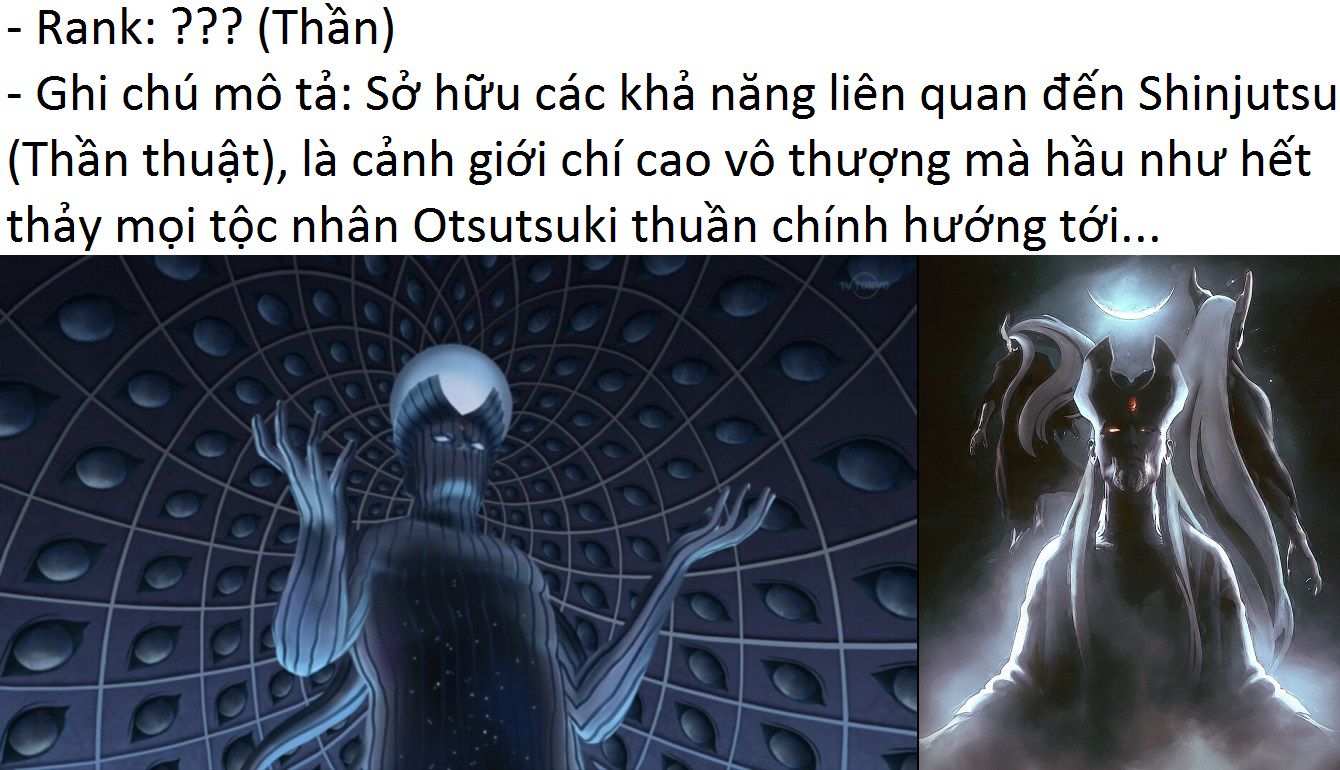 - Rank ??? (Thần): Là cấp độ cao nhất từ trước cho tới nay mà chúng ta được biết và đồng thời cũng là ước muốn hướng tới của hầu như đa phần các tộc nhân Otsutsuki (VD Momoshiki, Isshiki, Urashiki,...) với các loại năng lực/skills liên quan đến phương diện Shinjutsu (Thần Thuật)! Chỉ đáng tiếc lúc này ngoại trừ những gì qua "tầm nhìn" của Isshiki Otsutsuki cùng đôi lời mô tả bằng miệng ở lão tiến sĩ Amado thì hiện tại vẫn chưa có thêm thông tin nào khác thế nên cảnh giới này vẫn chỉ là 1 bí ẩn giống như là bị 1 lớp sương mù bao phủ và cần thời gian tới để tác giả cung cấp thêm lời giải đáp!