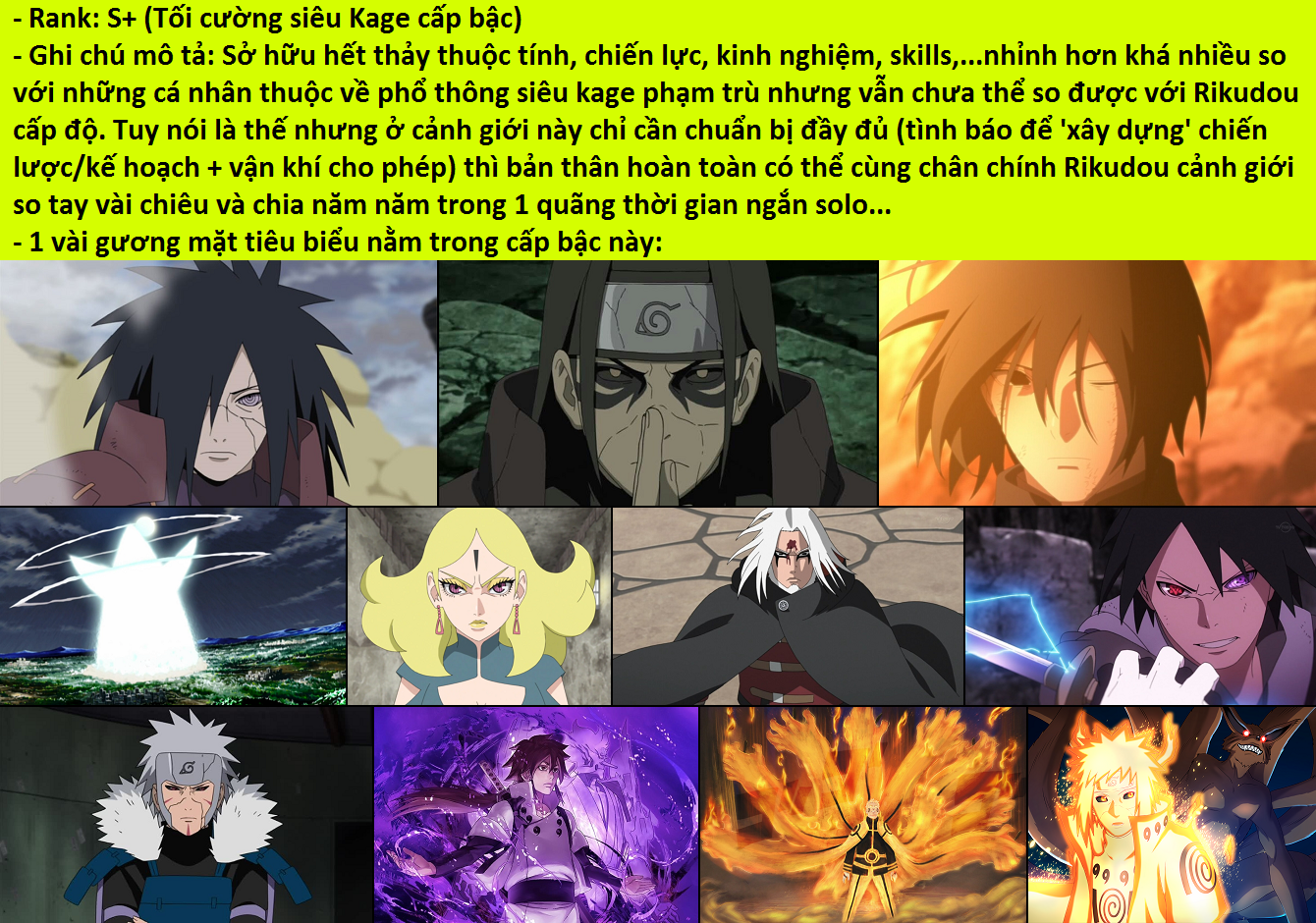 +) Trung giai tối cường siêu ảnh (trung cấp tối cường siêu kage): Sasuke Uchiha thời Boruto (khi vẫn còn sharinegan - 6 tomoe Rinnegan); Kashin Koji sennin modo;...