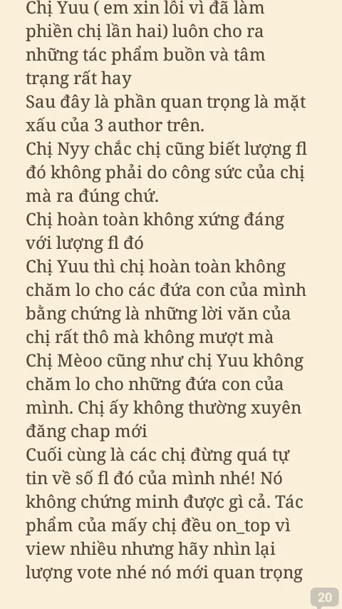 Em bảo các chị ý không xứng đáng với lượt fl? Oh shiet, hôm nay em làm chị văng phụ khoa hơi nhiều rồi đấy. Bình thường chị chả thèm văng đâu, nhưng em thì chả nói nhẹ được đâu! Các chị ý không kiếm fl từ truyện của các chị thì lấy từ đâu? Từ trên trời à? Hay do chơi bốc thăm trúng thưởng? Ngưng ngay cái suy nghĩ đấy đi, vì chị thấy em trẩu quá rồi đấy câng ạ.