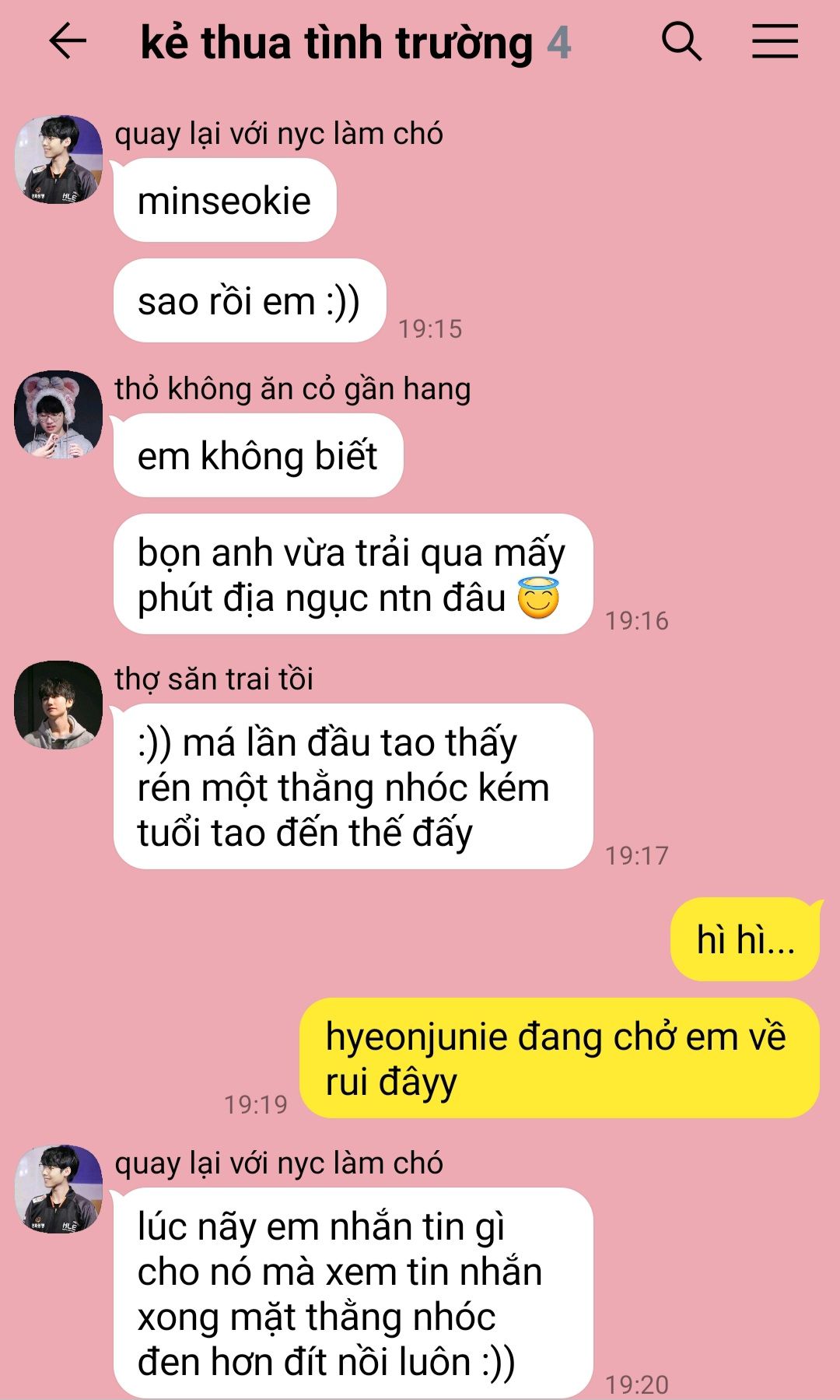 "cũng tự biết cơ đấy." moon hyeonjun liếc em vừa châm chọc nói. "tao cũng không dám để mẹ gặp nhóc chuột lột đâu nhóc chuột lột ạ, mắc công mẹ lại mắng tao không biết chăm em. trước lúc đi đón em tao nhắn tin hẹn mẹ cuối tuần này rồi, mong con trai ruột mẹ moon dành thời gian cuối tuần theo đứa con ghẻ này về thăm mẹ nhé!"