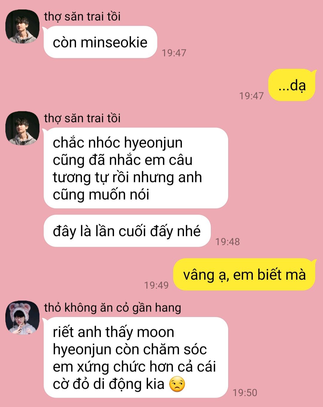 "sao nào, tao đánh sai hả? mải nhắn tin quá đến nơi rồi cũng không biết, giờ tao mà đưa em sang trung quốc bán chắc em cũng chẳng biết đâu đấy nhỉ? tin người quá vậy?" moon hyeonjun chống tay lên tay lái, hai mắt chăm chú nhìn gương mặt nhăn nhó của người trẻ con bên cạnh, phì cười bất lực.