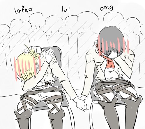 Levi:*Chạy ra ôm Eren* Chuyện này mấy đứa không cần biết!!!Đừng tra tấn Eren nữa!!!Có phim cho mấy đứa xem rùi thây!!!Lần trước Erwin còn trèo hẳn xuống gầm giường bọn anh mà!!!