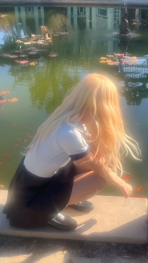Mái tóc vàng óng mượt của cô ánh lên dưới ánh nắng dịu dàng, bộ đồng phục giản dị lại càng làm tôn lên vẻ thanh thuần. Khung cảnh hồ nước tĩnh lặng với những chú cá nhỏ bơi lội xung quanh như một bức tranh hoàn mỹ, và Rosé chính là điểm sáng nổi bật nhất trong đó.