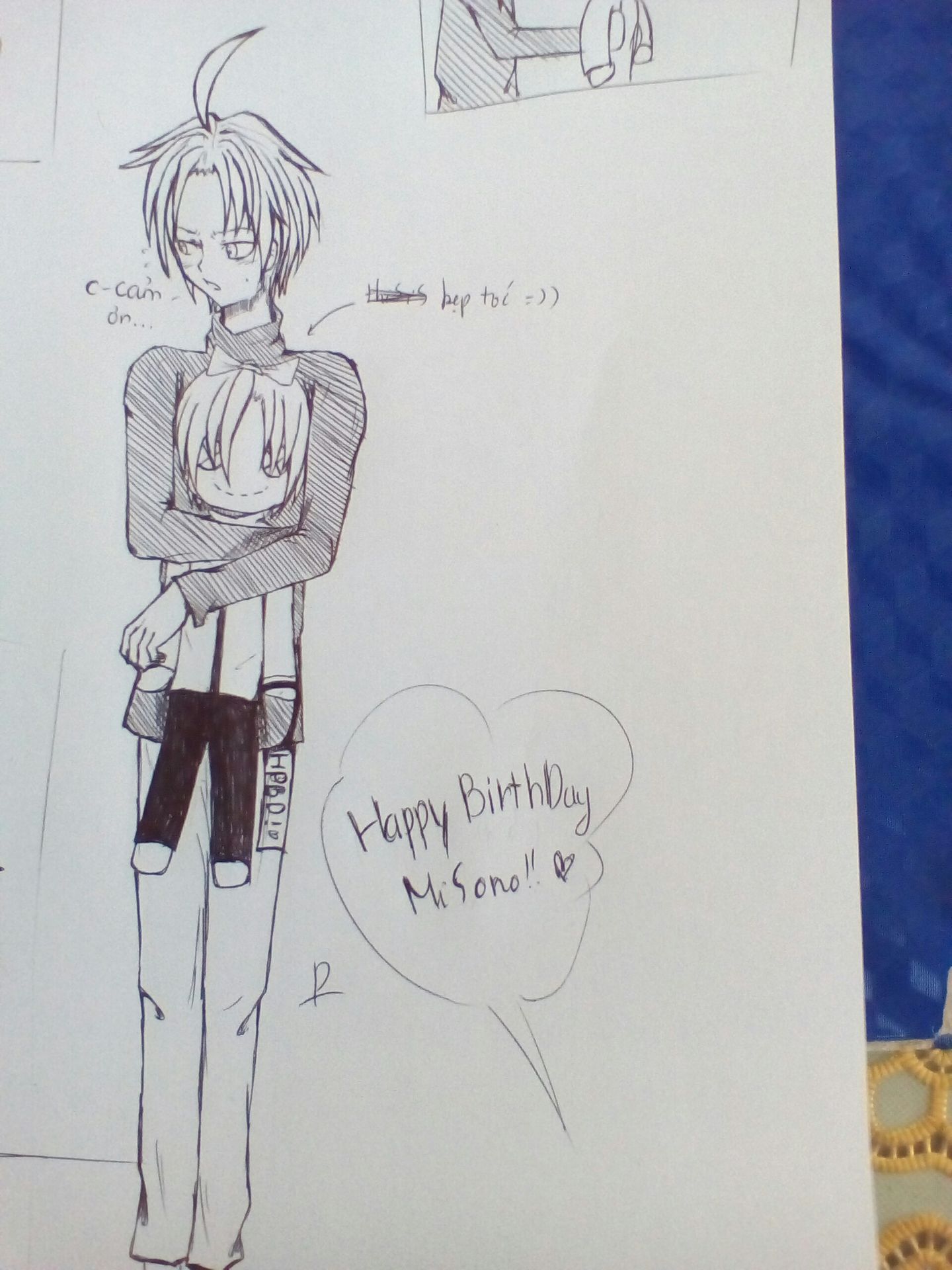 - À, hôm nay là sinh nhật cậu mà phải không ? Bọn tớ đến chúc mừng đây ! Happy Birthday Misono! - Mahiru vui vẻ nói, cậu đặt hộp quà được gói giấy màu nâu cam lên bàn.