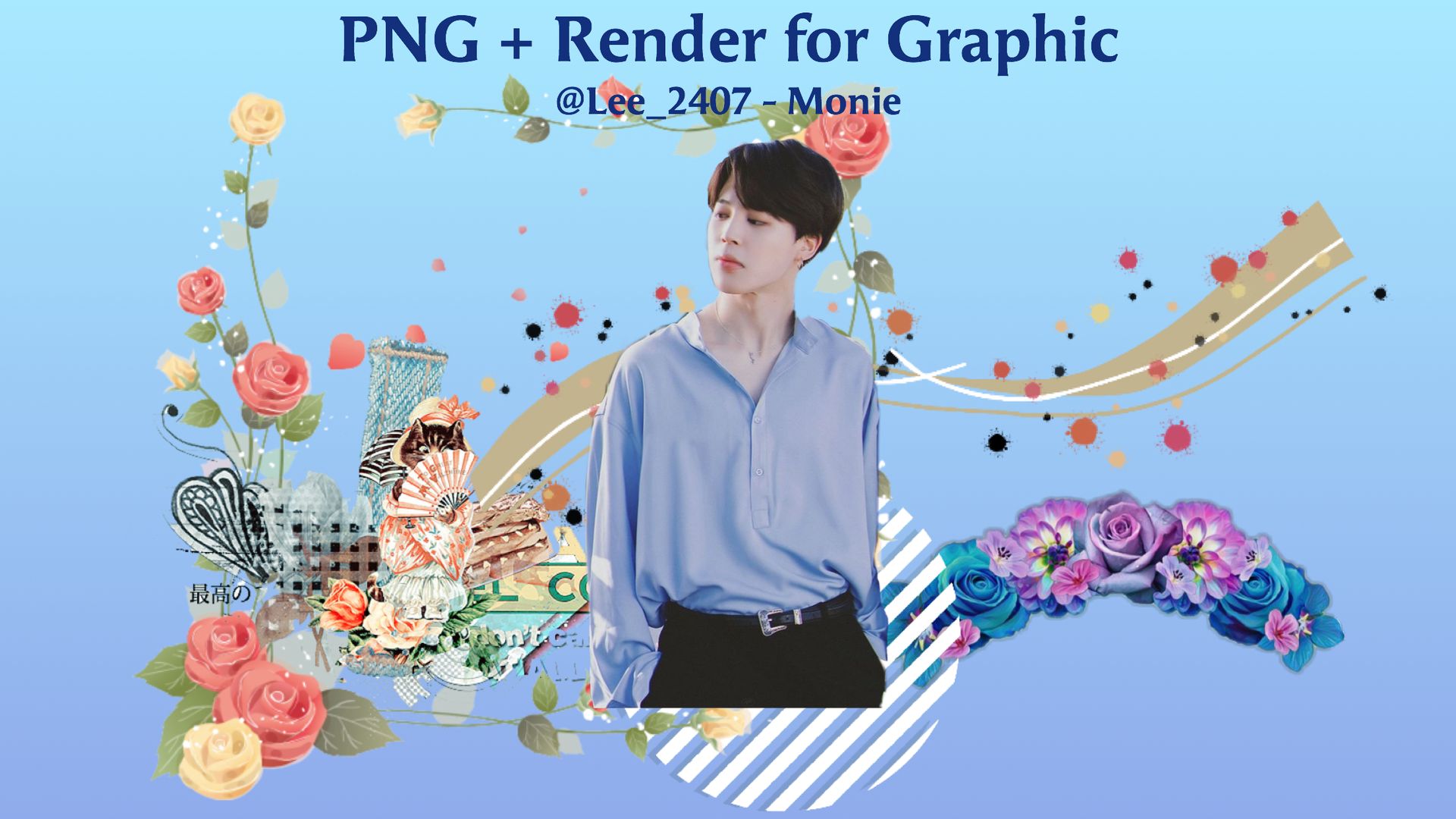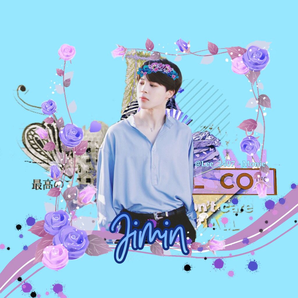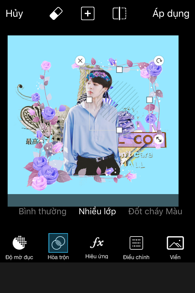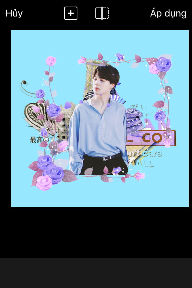 Bước 3: Chèn render tuỳ thích (có thể vào "Nhãn" tìm kiếm với từ 'idol+png', vd 'Jimin BTS png'). Sau đó phóng to nhỏ, điều chỉnh, sắp xếp sao cho vừa mắt. Ở đây tớ đã điều chỉnh cho màu của các png thành màu xanh. Các cậu chỉ cần chọn png đó rồi chọn "điều chỉnh", chọn "sắc độ", kéo về phía bên trái <= sao cho hợp với stock đó nhé! Tiếp theo tìm các png khung hoa, vẫn là từ khoá "watercolor flower" nhưng mà tìm khung dạng hình vuông nhé. Tiếp tục di chuyển, điều chỉnh sao cho phù hợp.