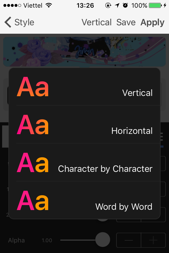 Text của tớ là "Jimin". Các cậu muốn làm nó có hai màu thì vào "Style", chọn "Create Color Pattern" hoặc ấn vào cái ba dấu - ở dưới cùng. Nó sẽ hiện ra thế này. Sau đó các cậu chọn cái dòng "Horizonal (C)", chọn "Vertical".
