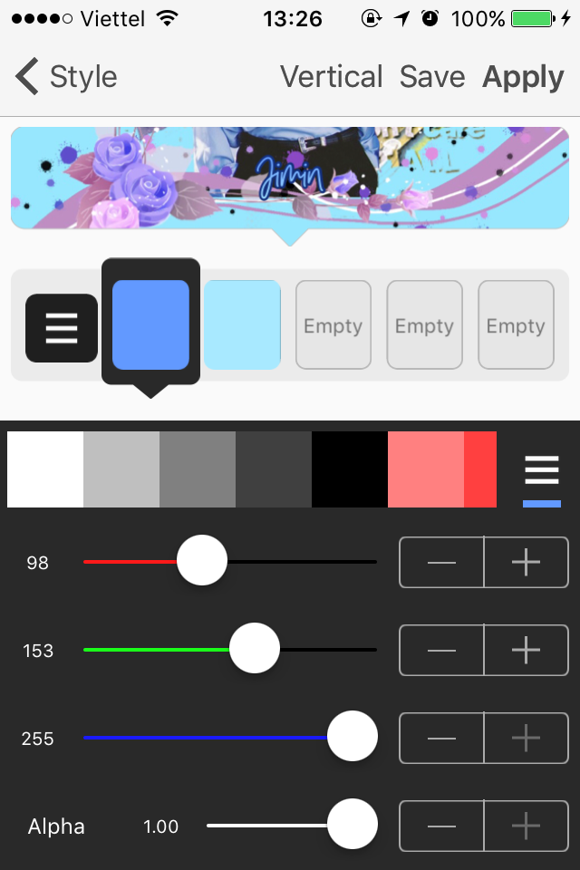 Ở cái bảng màu "Empty" các cậu chọn màu như tớ. Nếu không có màu này, là do các cậu không có :))) vì đây là tớ tự phối màu. Ai cần màu này thì cmt tớ sẽ cho công thức.