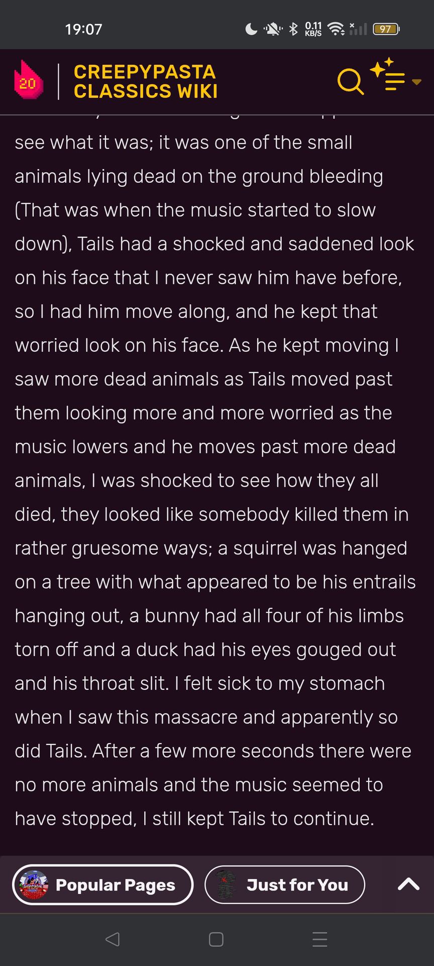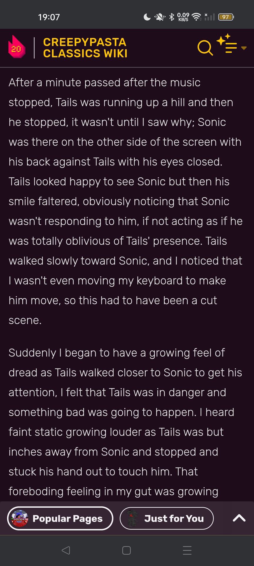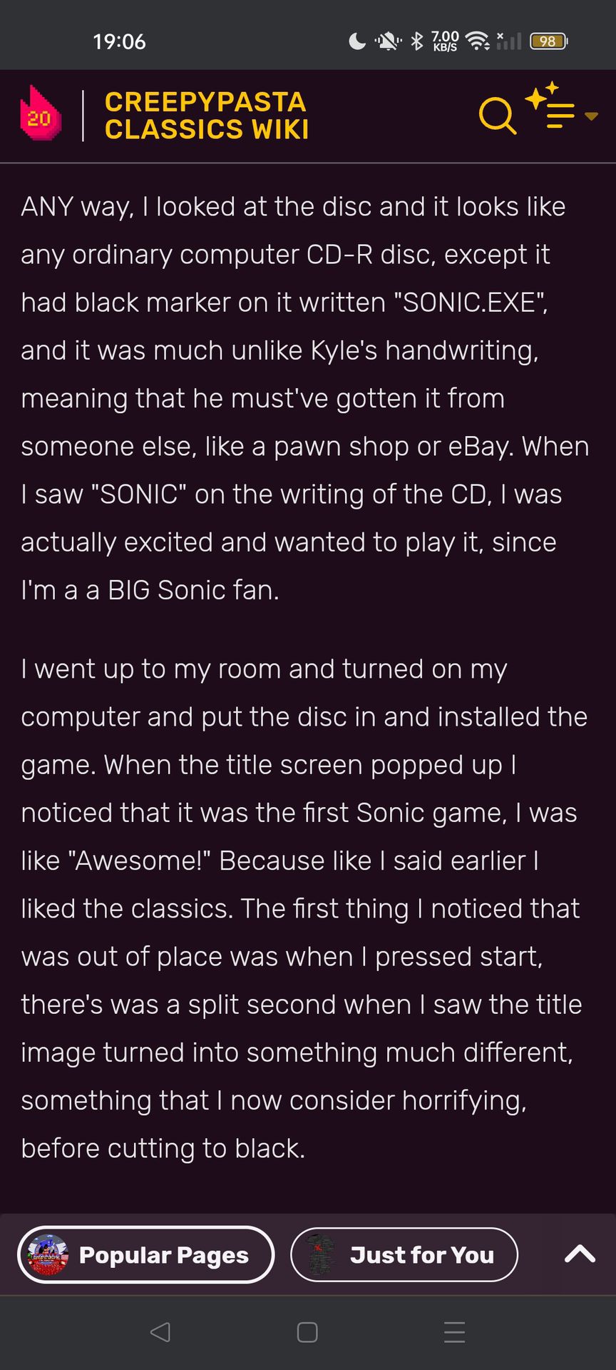 một ngày đẹp trời cô đang ngồi lướt điện thoại ở trang Creppypasta Wikipedia thì cô vô tình đọc phải một trang truyện về Sonic exe.