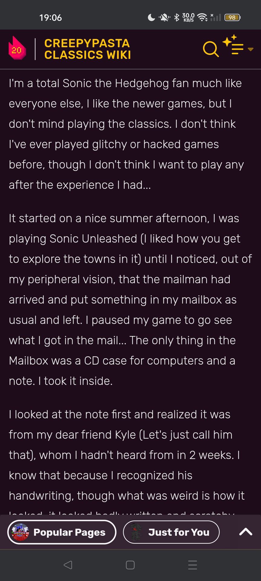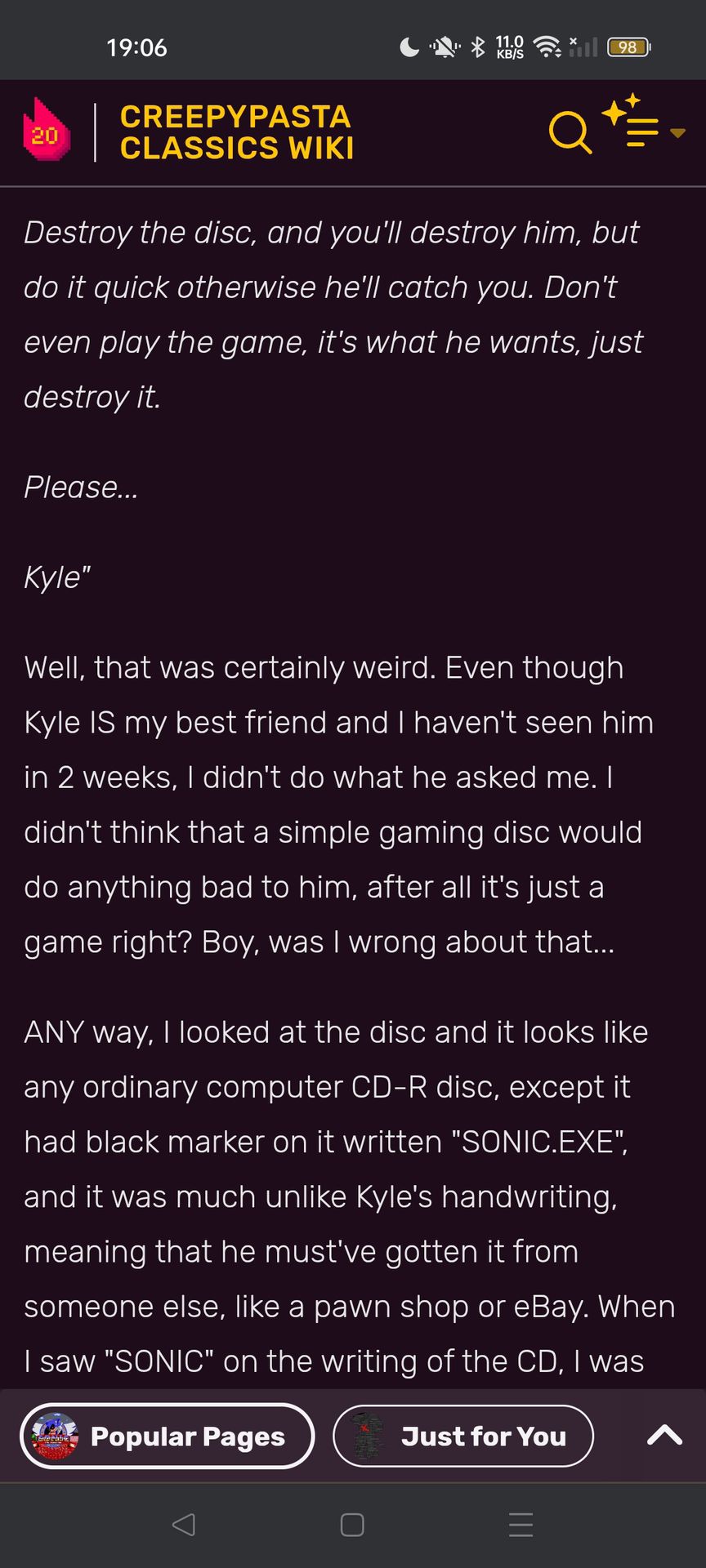 Sau khi đọc xong vì bé nó nữa tin nữa ngờ nên em nó lên YouTube xem phân tích về cái truyện ấy, sáng hôm sau, Mary nghe thấy tiếng chuông cửa vang lên ở dưới lầu, cô đi xuống mở cửa ra thì đếch thấy ai, chỉ thấy một cái thùng bên trong là một cái đĩa có ghi chữ "Sonic exe" ở trên.