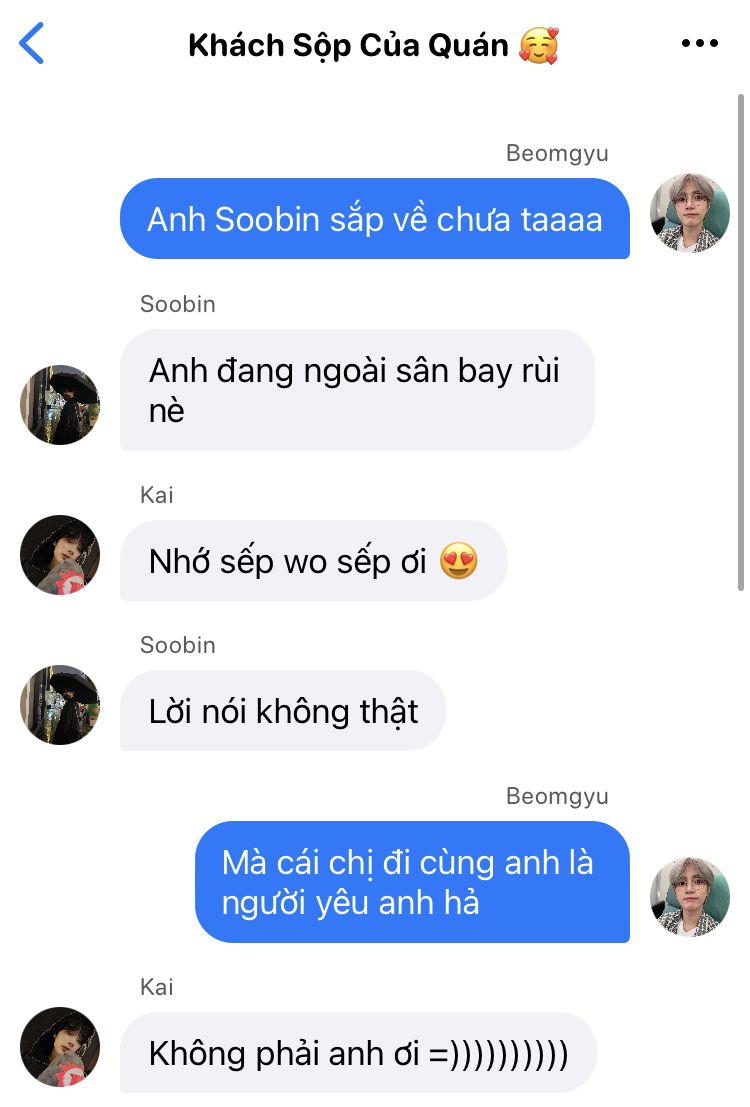 Soobin nghĩ mình đang đến không đúng lúc lắm nhỉ? Vừa bước vào đã thấy Taehyun ngồi trên sofa với khuôn mặt đỏ bừng, đương nhiên mặt Beomgyu cũng đỏ không kém. Chắc hai đứa này vừa chửi nhau xong.