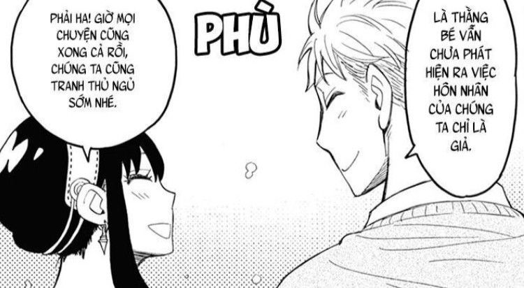 Anya nhíu mày nhưng vẫn múc thìa canh, còn Yor thoáng liếc anh, khẽ cười bối rối:
