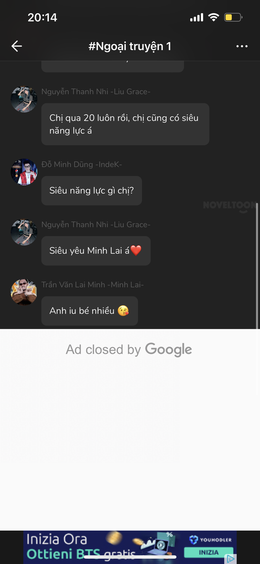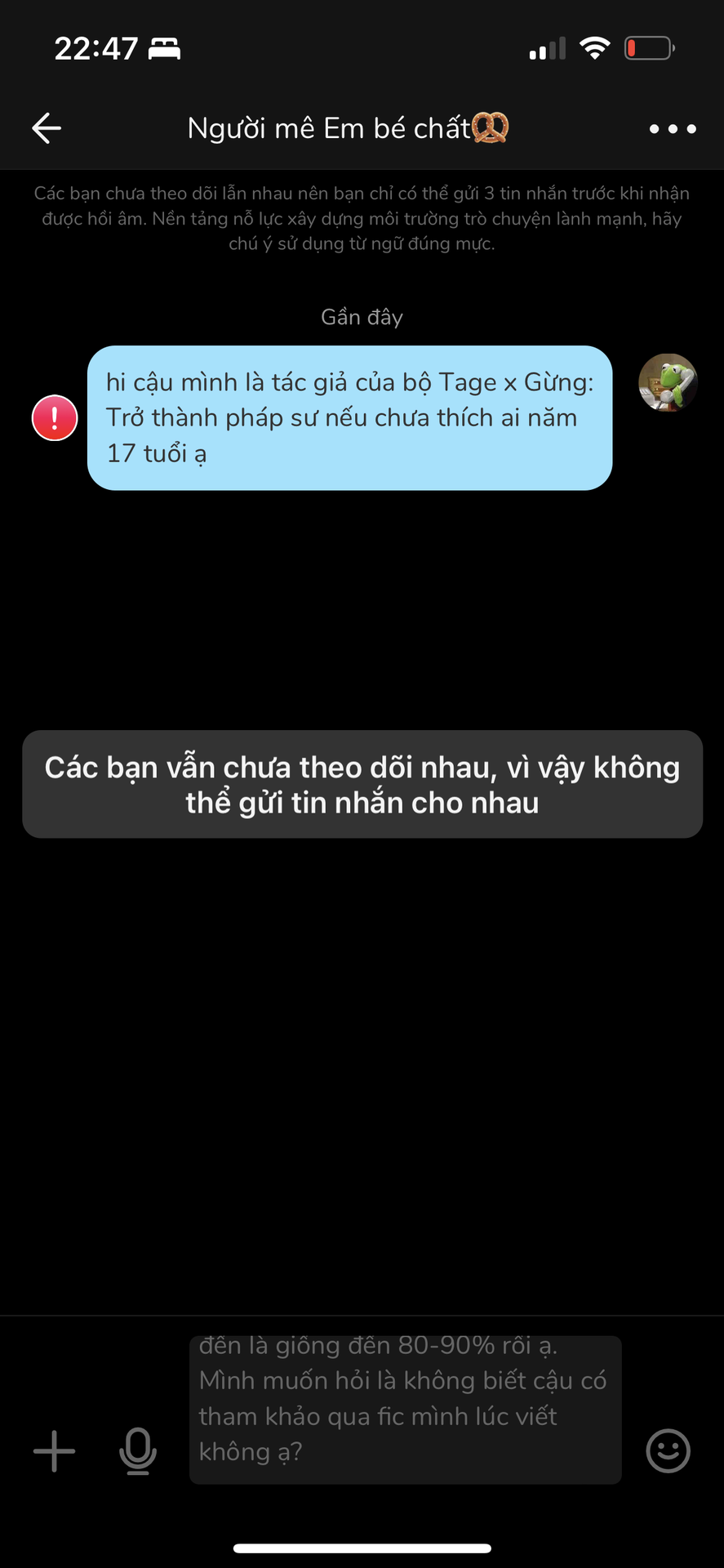 cmt trên mình cmt thì bạn au lại không có trả lời gì. mình cũng đã thử nhắn tin riêng với bạn í nma chính sách của noveltoon lại không cho phép mình nhắn tin 🤡 (mình đã follow bạn ấy rồi nhưng bạn ấy không follow lại mình thì mình cũng không gửi tin nhắn được)