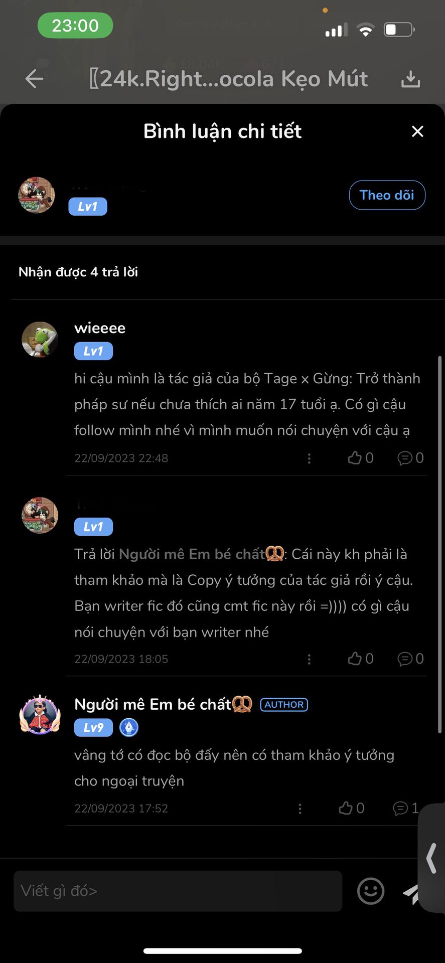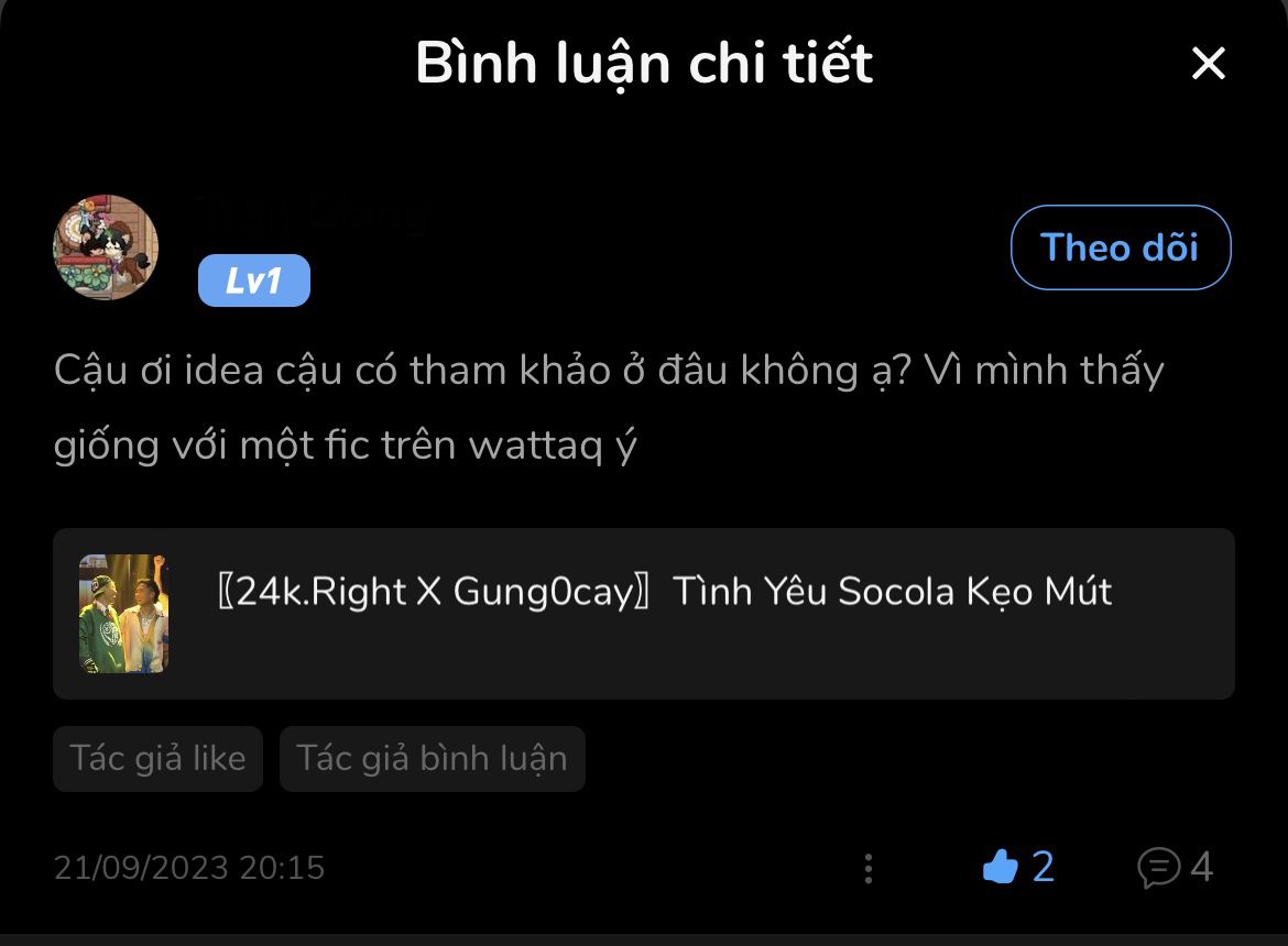 ngay từ ban đầu mình không muốn đem việc này lên đây, mình muốn giải quyết riêng với bạn trước. nhưng như mình đã nói ở trên, mình không thể nhắn tin với bạn và bạn có vẻ là cố tình phớt lờ cmt của mình đúng không ạ? mình check thì thấy bạn vẫn hoạt động bình thường. hay ngay khi mình cmt thêm dưới cmt của bạn mình là bạn cũng không nói gì thêm luôn. nhưng cái hành động "lặng lẽ" xoá các chương truyện đi của bạn làm mình tin rằng bạn đã thấy được cmt của mình rồi. nếu bạn thấy rồi thì sao không follow mình lại để chúng ta có thể nhắn tin trực tiếp với nhau ạ? nếu có gan làm thì phải có gan chịu chứ ạ?