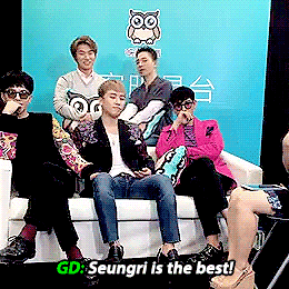 G-Dragon: Taeyang đang ghen tị đấy, Seungri rất thích tôi, rất rất thích tôi. Nhưng mà Taeyang lại thích Seungri. Nên Seungri thành ra bị kẹt giữa 2 hyung mà không biết làm thế nào.