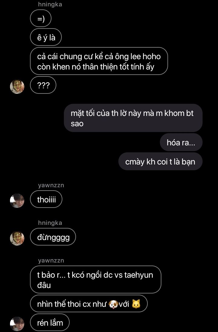 "ừm, tao còn chả biết tại sao nó bệnh nữa. mới hôm qua nó còn vào gúp nói xấu mày cho tao với huening, giờ nói lại lăn đùng ra bệnh"