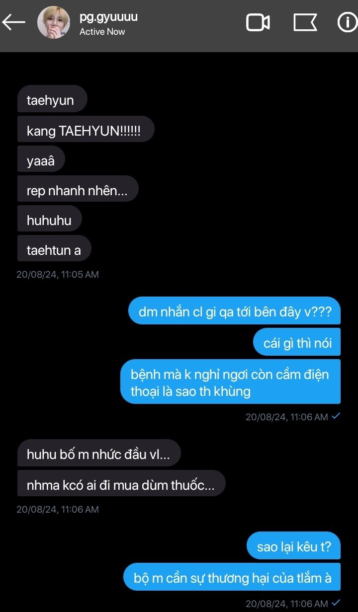 màn hình điện thoại taehyun hiện ra cuộc gọi có tên @pg.gyuuuu. ban đầu taehyun không bắt máy. nhưng thấy beom gọi liên tục không ngừng nghỉ, spam cuộc gọi rồi tin nhắn cái nào cậu cũng spam, spam từ zalo qua tới Facebook rồi đến hẳn X do bên ig taehyun không thèm nghe.