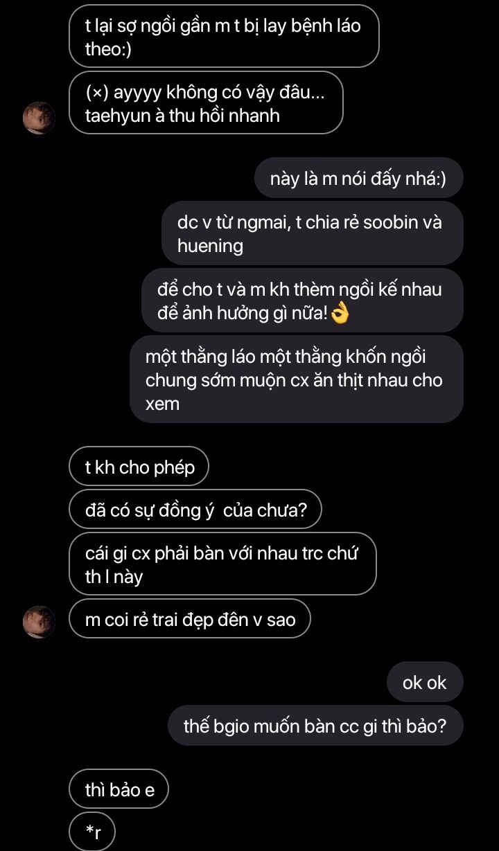 "mày khoan hả bắt lỗi soobin :), hoon với hyunjin nó đang ăn vụng mà giấu mày đó. bởi vậy nó im"