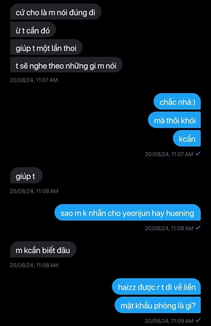 "mày lo mà kéo huening ra khỏi nó đi, nó hành người ta giải toán cho nó mắc mệt. hồi xong nó xuống tìm bọn tao liền chứ gì"