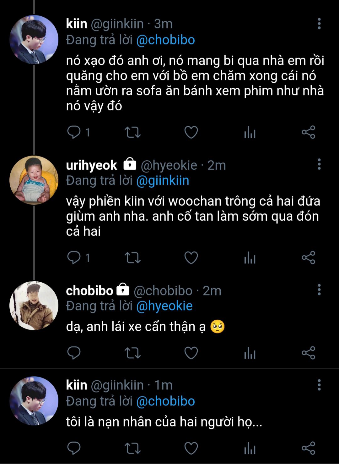 trong đó có park jaehyuk. gã nghe tin bi bị bệnh thì video cho jeong jihoon để hỏi thăm. bi ngồi trong lòng jeong jihoon nhưng vừa thấy gương mặt của park jaehyuk hiện lên liền quay người úp mặt vào cổ jeong jihoon.