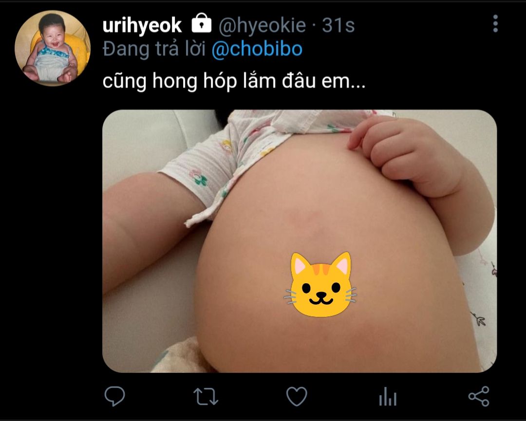bi không trả lời, chỉ dụi đầu vào cằm cậu, cái má sữa chạm vào má của người lớn hơn. hơi ấm từ cơn sốt vẫn còn nên cái má mềm thơm như cái bánh bao hấp còn ấp vậy. muốn cắn một cái.