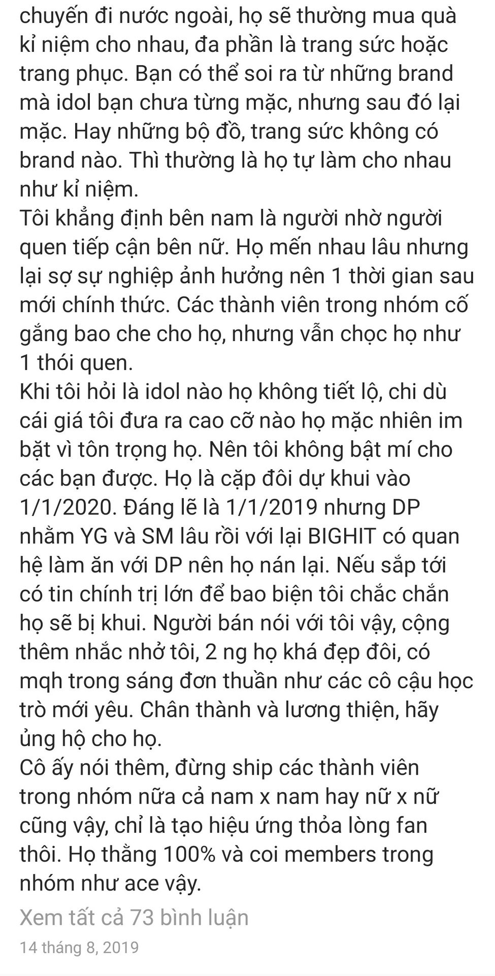Mình từng đọc một cái bài post về việc hẹn hò của BTS nhưng tiếc là do lí do bảo mật nên đã xoá post đó rồi.