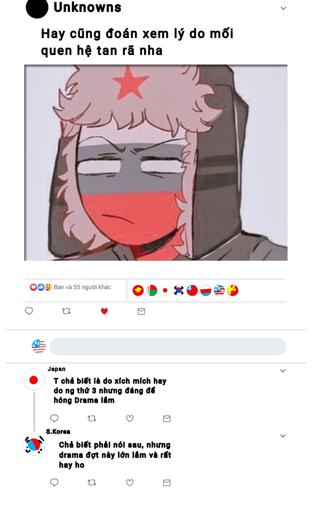 Sau vụ chia tay li kì của Russ và Ame dường như vẫn chưa hết hạ nhiệt cộng thêm đó là bao buổi giải hòa của UN, nhưng như cũng có rất nhiều tin đồng về người thứ 3 chen vô mối quan hệ của hai ông lớn này. Gần đây có 1 tài khoản ẩn danh đột nhiên buôn nhưng lời động kì quặc, dễ gây ra những hiểu lằm khó giải thích và ẩn thưởng đến người khác.