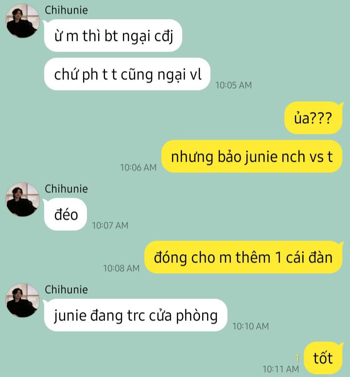 🐯: sori nhưng mà do mày nên tao chỉ biết ngồi đây ôm em yêu tao chứ biết làm gì giờ TRỜI MÁ ƠI COI JUN NÓ NGHIẾN KÌA TRỜI KHẶC KHẶC KHẶC