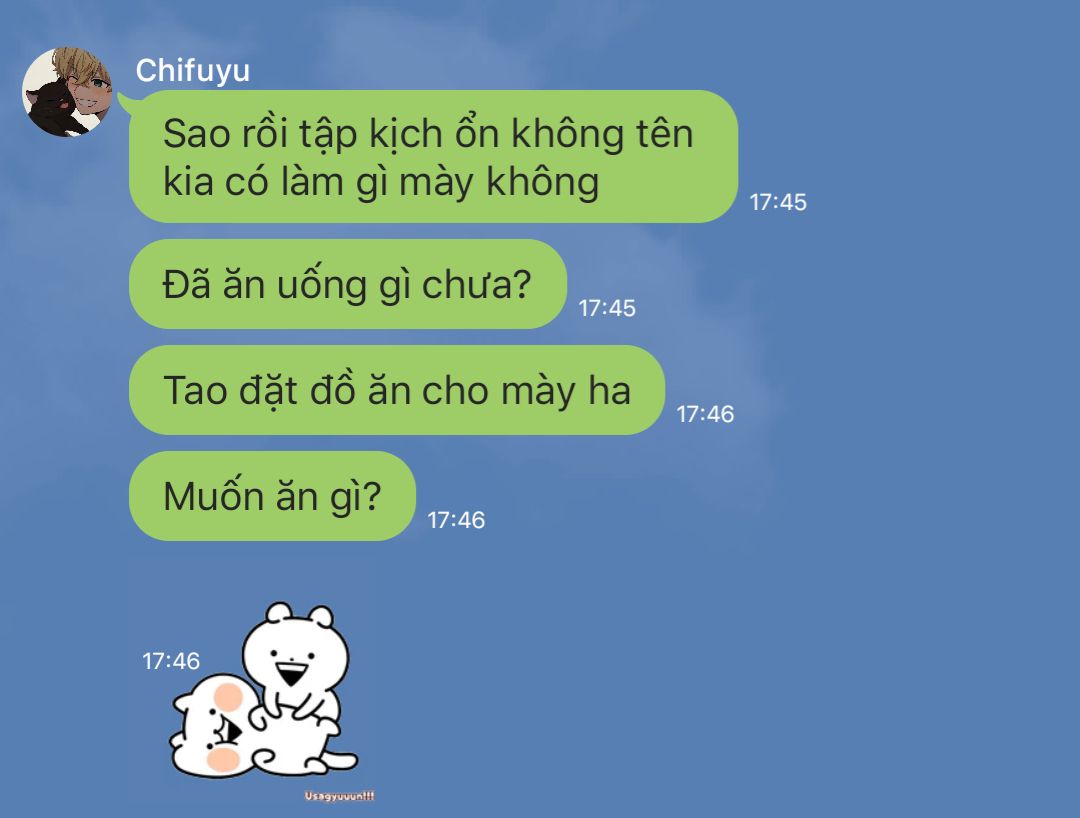Chifuyu nhìn cuộc gọi kết thúc, xoa xoa mày, lại thấy hình ảnh Takemichi gửi qua cho mình, là ảnh bữa tối cậu ta đã đặt. Cơ mặt Chifuyu giãn ra, nhanh chóng trả lời tin nhắn của Takemichi.