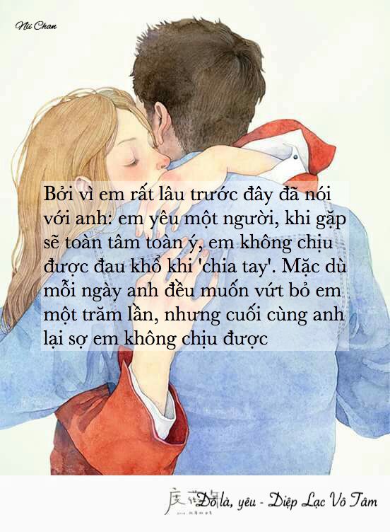 • Bởi vì em rất lâu trước đây đã nói với anh: em yêu một người, khi gặp sẽ toàn tâm toàn ý, em không chịu được đau khổ khi 'chia tay'. Mặc dù mỗi ngày anh đều muốn vứt bỏ em một trăm lần, nhưng cuối cùng anh lại sợ em không chịu được