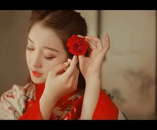 Ánh đỏ bừng, lần nữa nhuộm đỏ má phấn. Kiều sắc e lệ, giống như mùa xuân ấm áp, làm cho nàng như một đóa hoa, trở nên đỏ bừng .