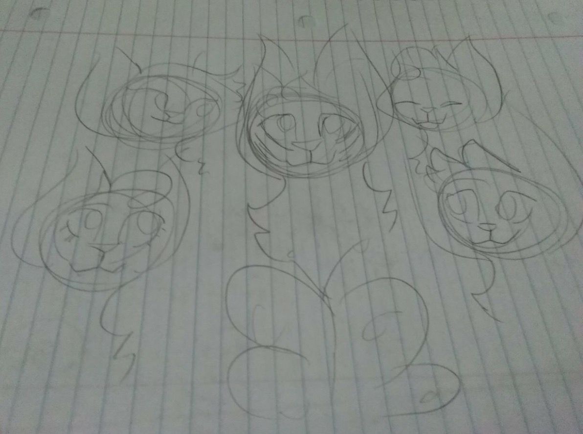 This art is by NeonKittyPoptart, and they drew a reference sheet for Berryblaze and Fernheart of PineClan's kits, whose names you can read on the paper. I especially like how Blazekit and Furzekit look for some reason. :0 Maybe it's Blazekit's expression and Furze's cheek fur and ears...