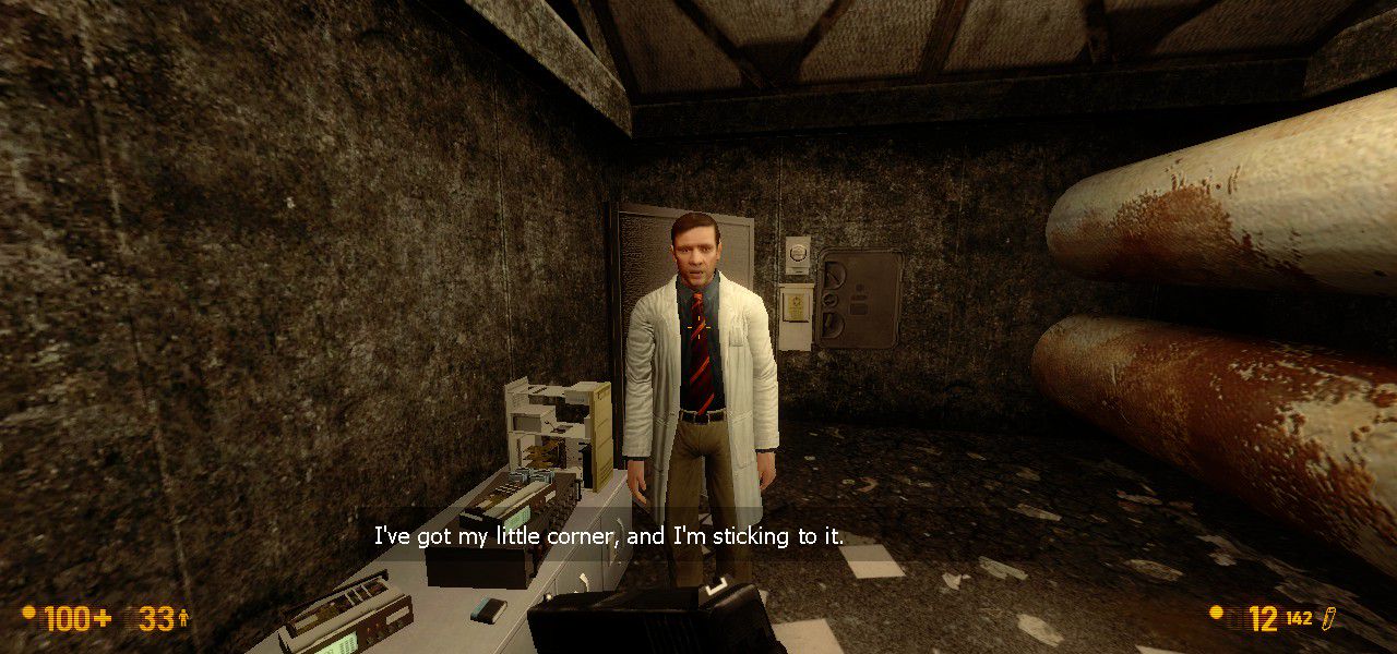 So with the realization that the help that's come is just as lethal as the hazards they were sent to help with, Gordon abandons in part the task he was given by Eli Vance, and decides instead (or it's decided for him by this random scientist?) that he's going to become the help he was sent to find. He's gonna go to the Lambda Complex and stop the aliens. Alone. Just him. Just Gordon Freeman.