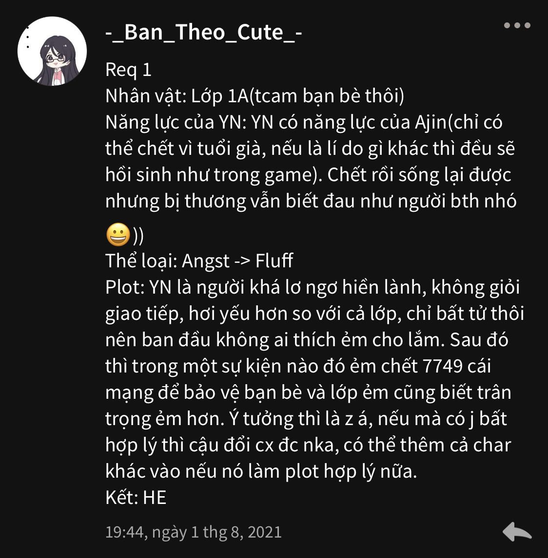 Y/N ấm úng nói. Mắt liếc về phía các bạn cũng lớp khác nói chuyện vui vẻ. Nghĩ đến mấy tháng trước khi mọi người biết năng lực của em là gì. Họ rất vui vẻ chào đón em.