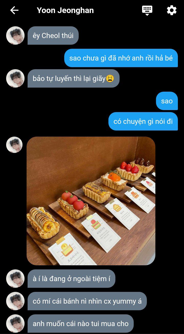 "Thì ra ngoài dự tính là mua mỗi cái bánh một chiếc với cả mua thêm vị đặc biệt sao cái ngốc này" tay anh véo má cậu.