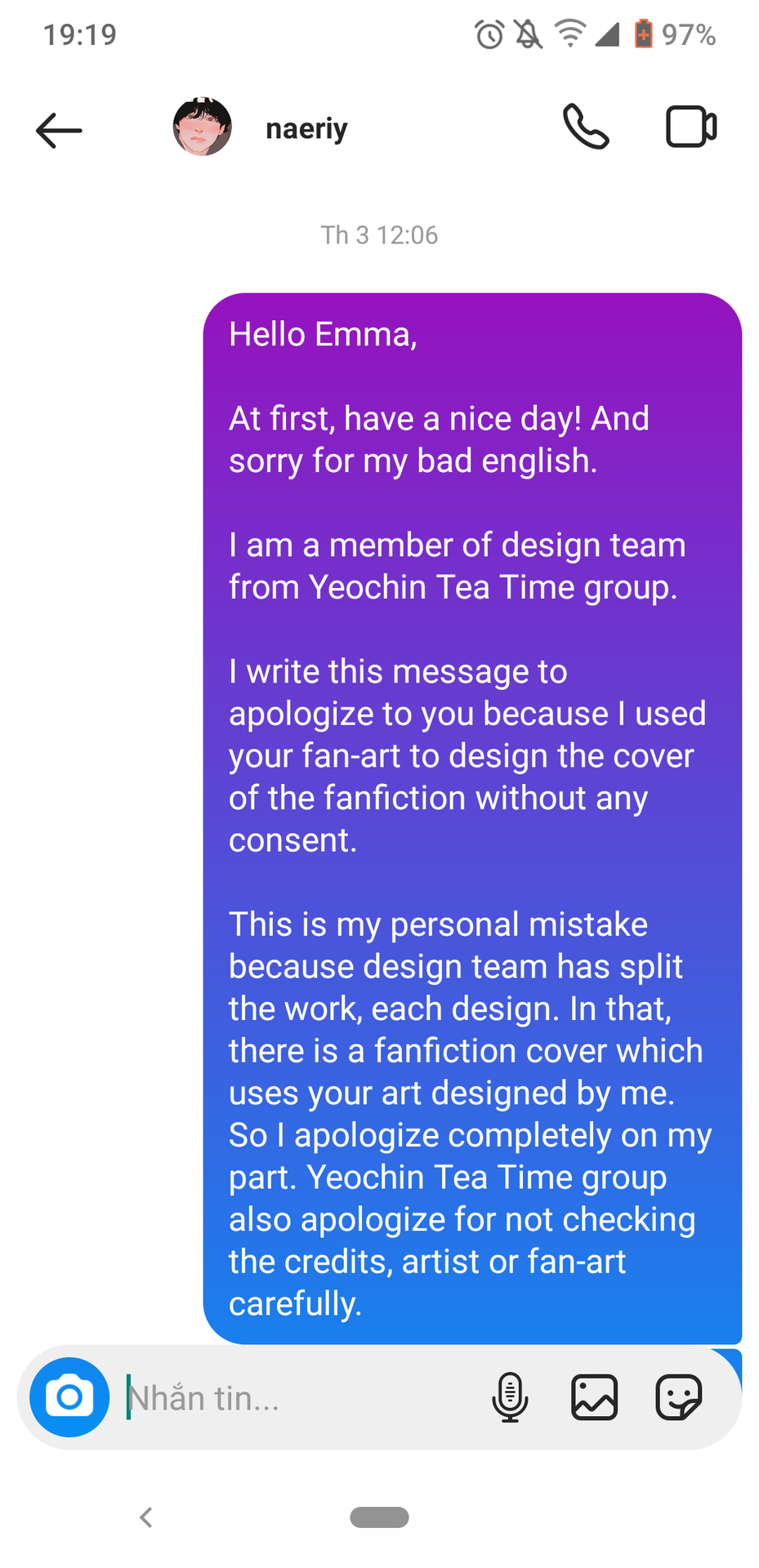 Tụi mình hầu hết tìm ảnh trên Pinterest. Khi tìm thấy fanart đó, bạn des-er cũng không biết nó là của TaeKook. Và điều tồi tệ đã xảy ra khi ảnh đó được dùng cho fic của JakeHoon. Sau khi được một người bạn nhắn tin nói đó là fanart của TaeKook thì des-er mới biết và chủ động đổi ảnh ngay để không gây ra ảnh hưởng gì thêm. Về phần tên chị artist thì bạn ấy cũng mới biết sau khi đọc #Enhypencfs3727 và chúng mình sau đó đã lập tức nhắn tin để xin lỗi chị artist qua instagram. Hi vọng sớm được nhận lời hồi âm từ tác giả.