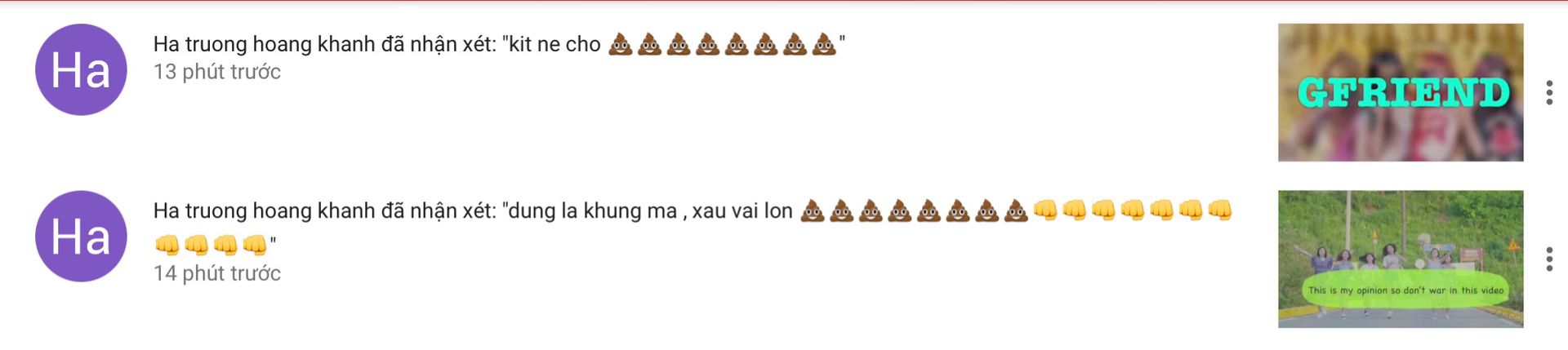 Nhìn video bên cạnh là biết rồi ha!? Lynn đã mửo thử vào kênh YouTube của nó nhưng cũng chẳng biết nó fan ai?! Mị không nghĩ là nó rảnh tới mức này luôn đó! Chỉ vì nó với Lynn cãi nhau bên một video của chị An Vy (thành viên FAP TV). Không biết là mọi người có biết không nhưng thôi. Nó là fan chị An Vy, và nó cũng là kiểu "trẻ trâu manh động", "tâng bốc Idol mình, hạ thấp Idol người khác", "thích đem so sánh các Idol với nhau". Và lúc đó Lynn đã... THAY TRỜI HÀNH ĐẠO!! *tự hào* :))), nhưng rồi chửi một hồi nó vẫn không biết điều, mặt còn dày hơn cái mặt thớt nữa 😔 Đã thế còn quay sang chửi Gái nhà, mình cũng định chửi nhưng thôi, chửi nó rồi nó lại nhục, khổ thân! Mà với lại nó cũng không biết nhục nên nói cũng tốn nước miếng của mình. lynn chỉ lẳng lặng mà xoá comment của nó, cứ mặc kệ cho nó sủa 😊 Có bị bệnh thì gọi bác sỹ hộ luôn!