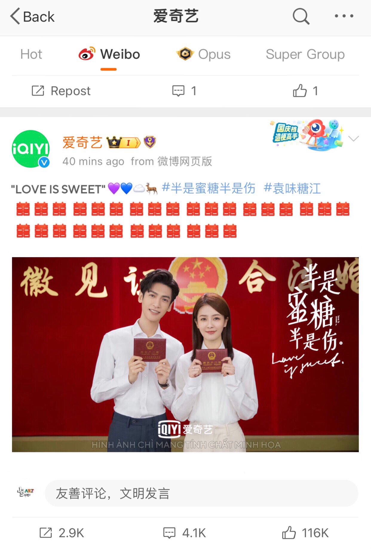 IQIYI - ÁI KỲ NGHỆ (爱奇艺) phát Weibo: "Tình yêu thật ngọt ngào." 💜💙☁🦌 #NửaLàĐườngMậtNửaLàĐauThương #ViênVịĐườngGiang