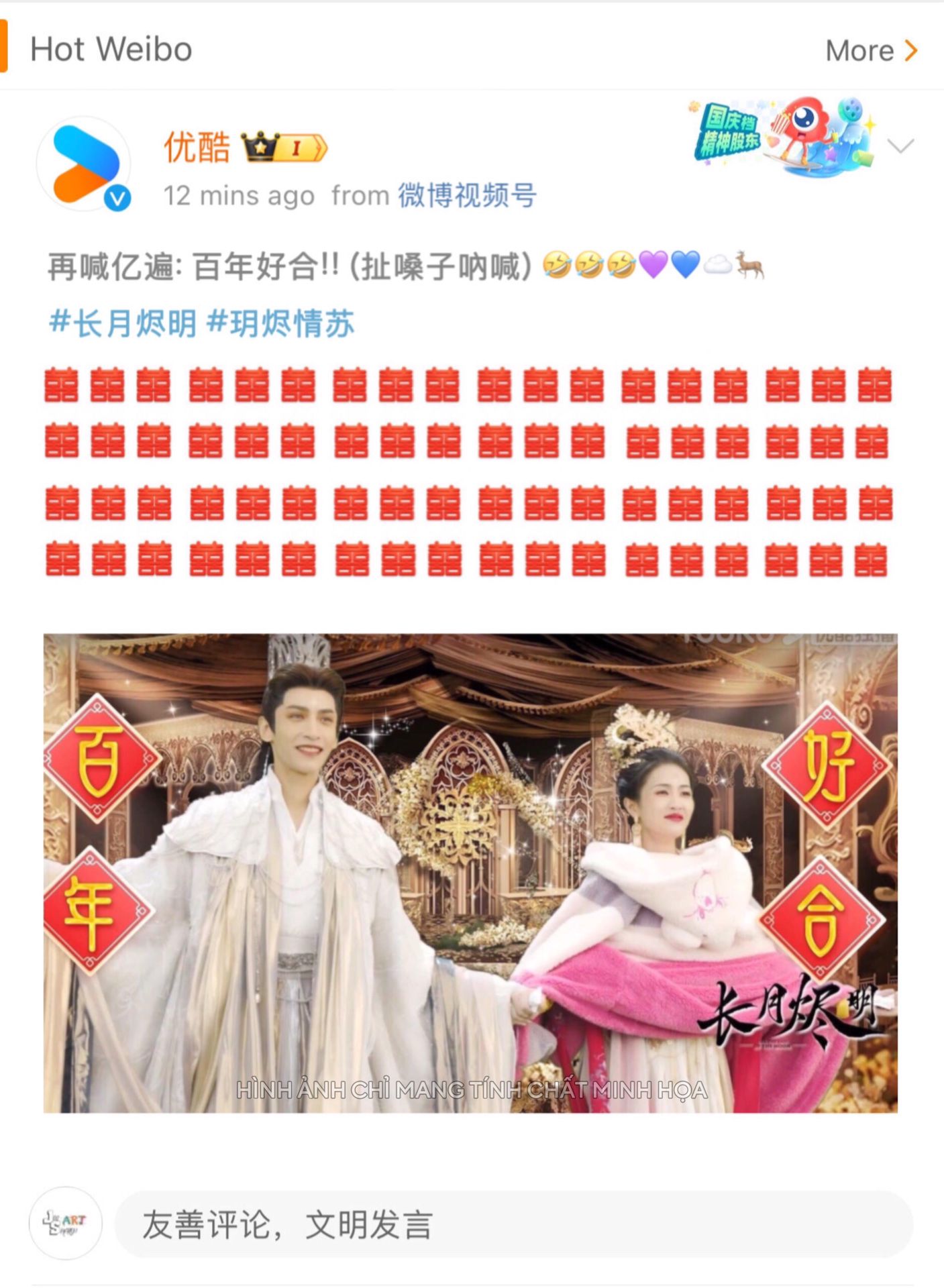 YOUKU - ƯU KHỐC (优酷) phát Weibo: "Lại hô trăm triệu lần nữa: Trăm Năm Hạnh Phúc!!" (Hét muốn banh cái cổ họng)😂😂😂 💜💙☁🦌