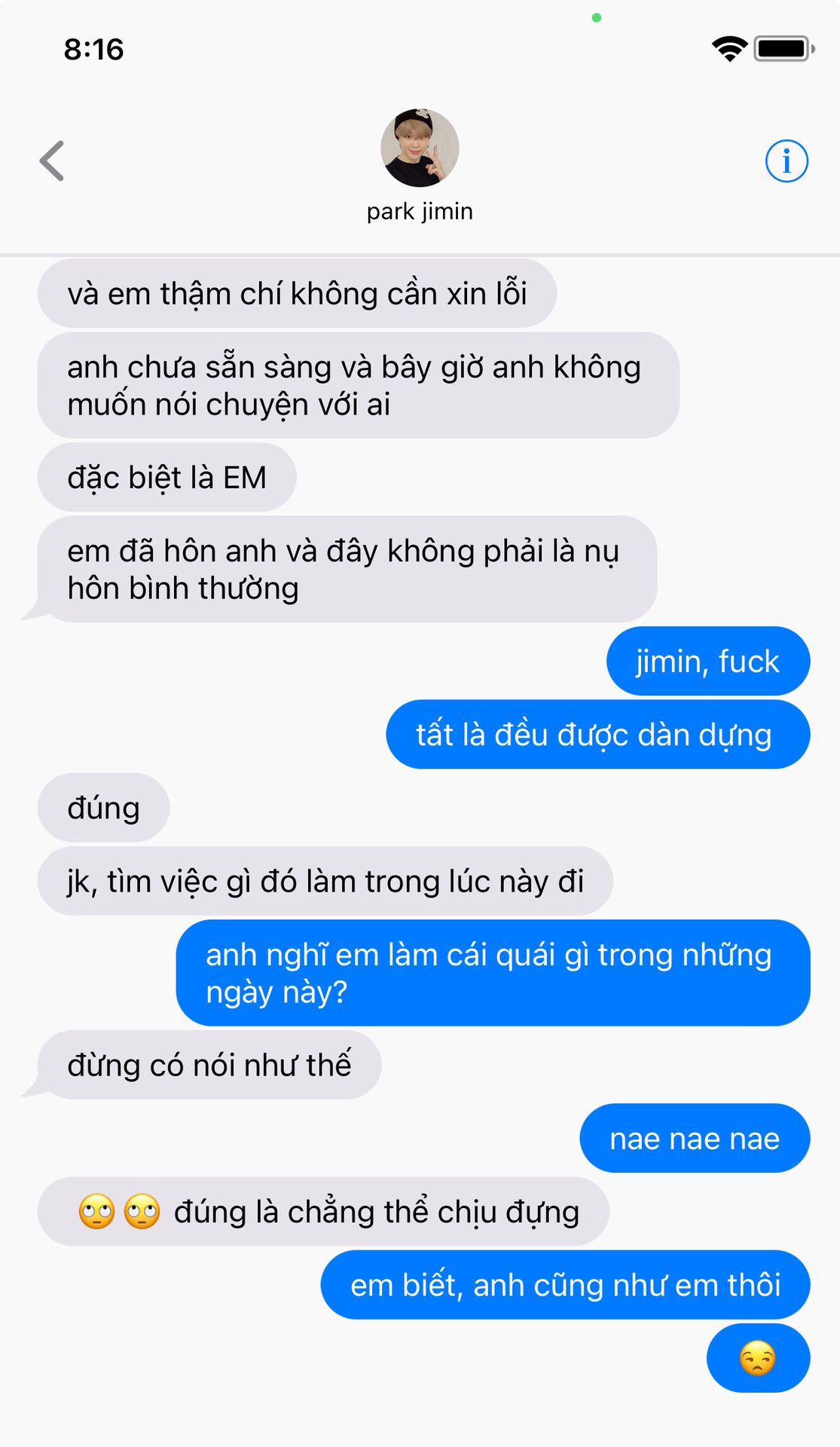 Hai người nhìn chằm chằm vào mắt nhau trước khi Jimin càu nhàu và nhắm mắt lại, tự trách mình vì hành động ngu ngốc của mình.