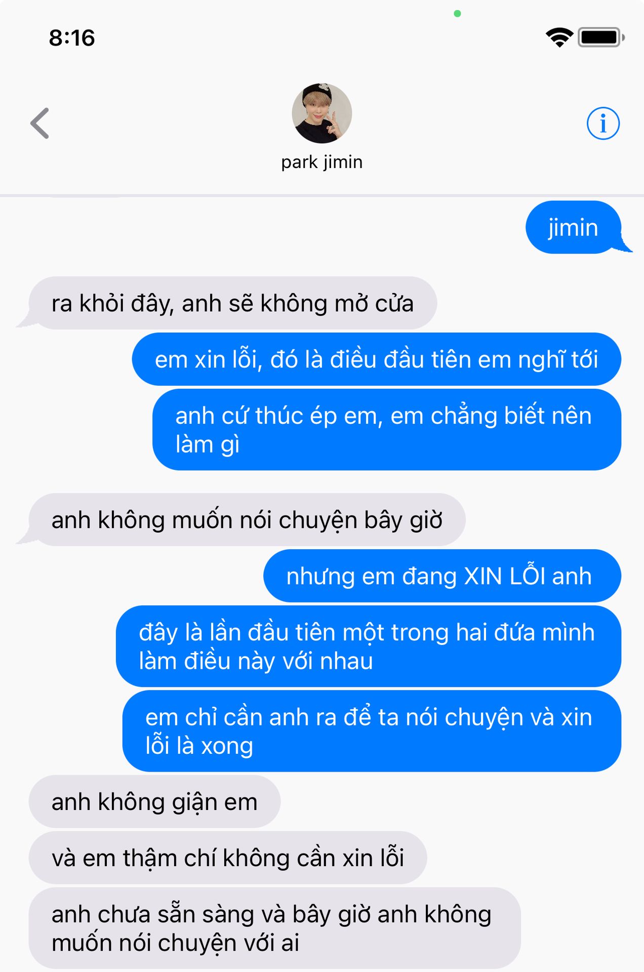 "Anh cũng thích em. Một chàng trai hoàn hảo một chàng trai rắc rối, phải không?" Jimin đỏ mặt và quay mặt đi.