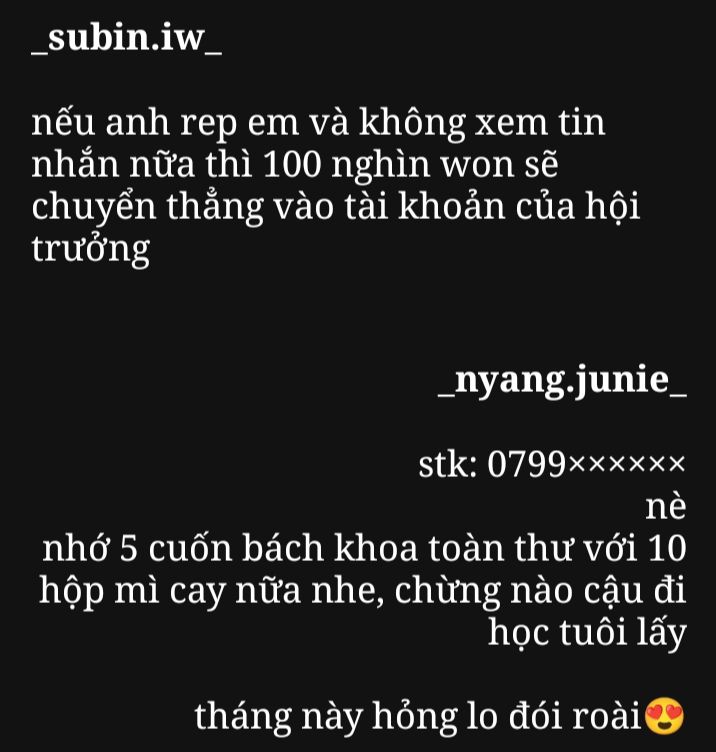 còn về phía hội trưởng bên này, chỉ mong ngày mai tên ngốc xít này đi học, anh sẽ có trong tay mình 5 cuốn bách khoa toàn thư và 10 hộp mì cay ăn hết tháng thoai, chưa kể còn có thêm 100 nghìn won trong tài khoản nữa, mày thật là thông minh mà yeonjunie, hong có ngốc xít như mọi người nói đâu à nhe(◍•ᴗ•◍).