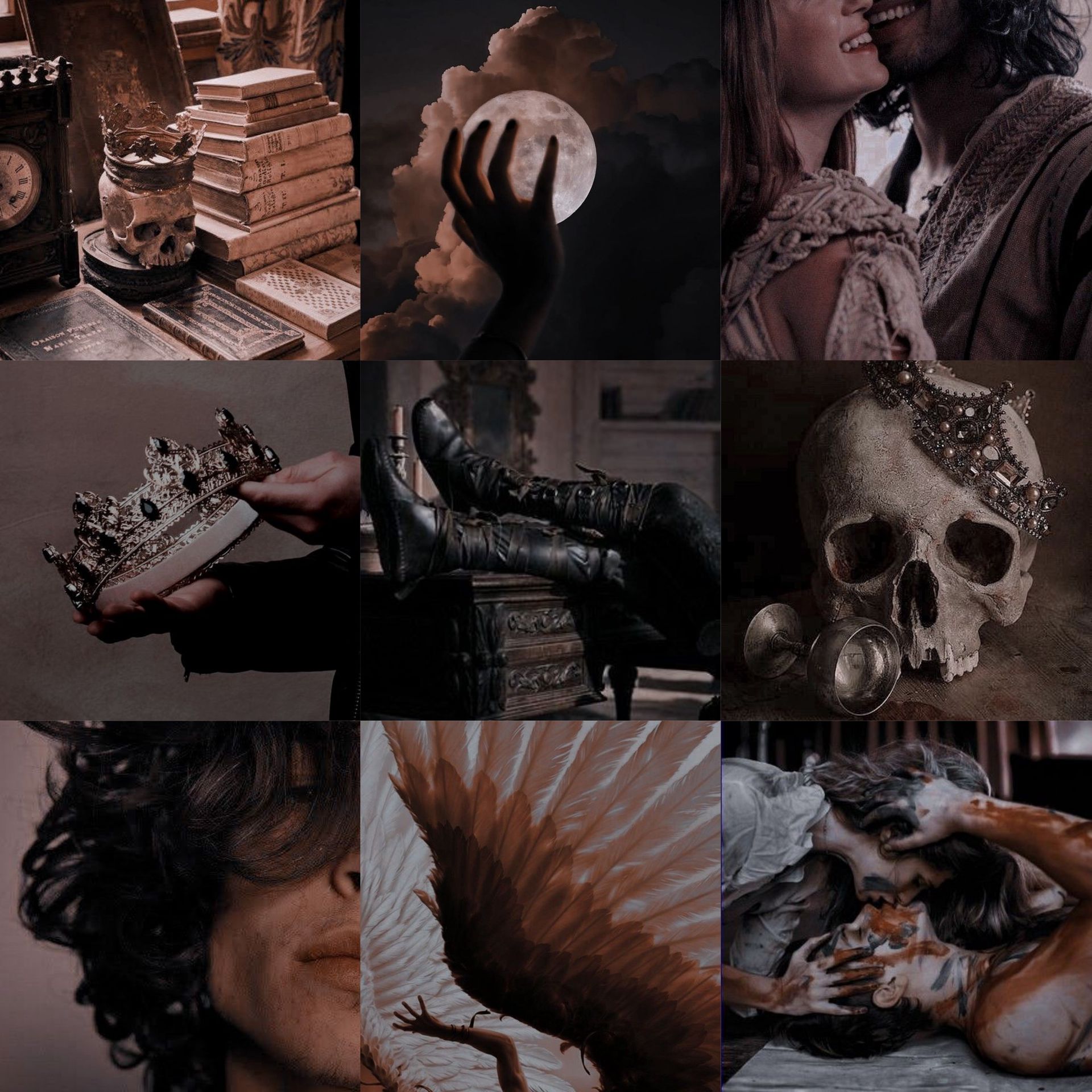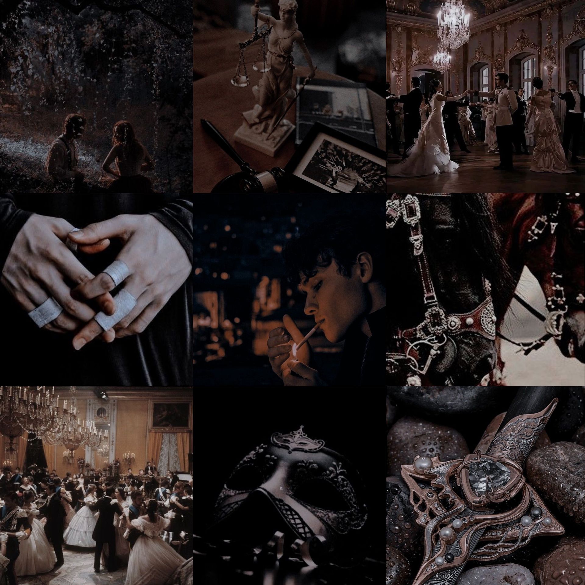 red wine spilling on lips, kisses hidden in the dark, bandaged hands, drunken promises, an alluring smile, dangerous eyes, plans of running away, broken crowns, the temptation of power, shards of class scattered on the floor, the deepest of thoughts, the dark smears of paint red as blood.