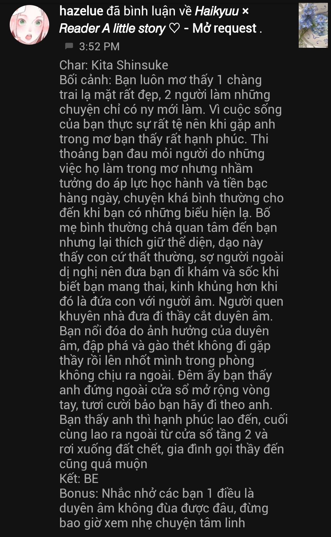 -"Này, bà có thấy con Y/n bị làm sao không? Dạo này tôi thấy nó hơi bất thường đấy." Bbố em vừa uống trà vừa lướt web nói.