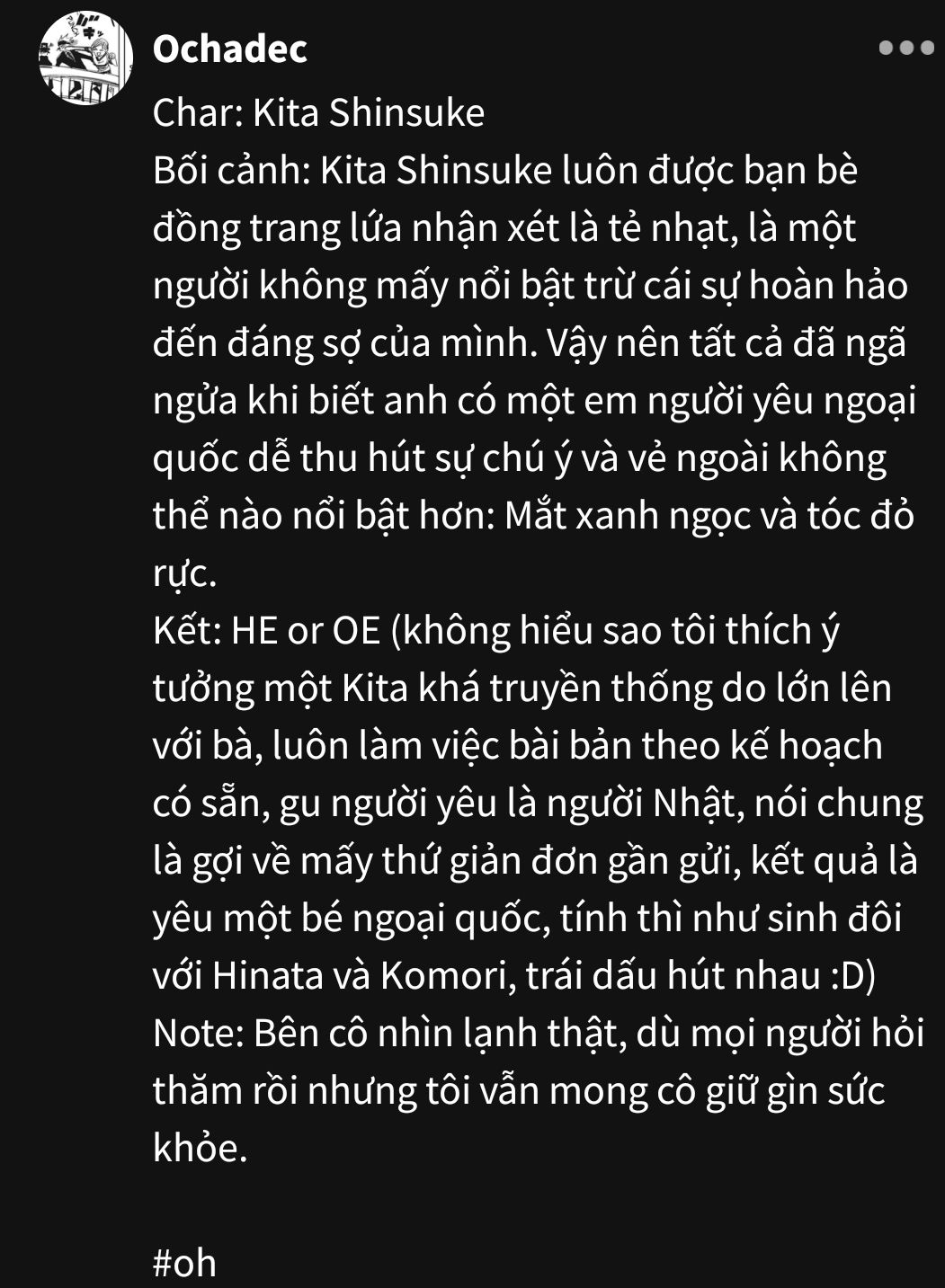 -"Không ngờ Kita-san như vậy mà lại có người yêu." Osamu cảm thán -"Thế thì em cũng sẽ sớm được gặp người mình yêu."